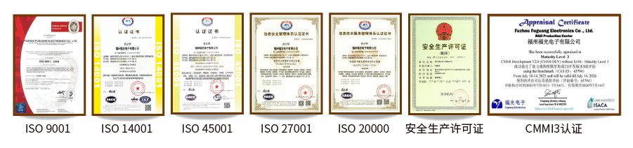 福(fú)光電子于2001年通(tōng)過了法國BVQI的ISO9001管(guan)理體系的認證(zheng),并獲得ISO14001環境管(guǎn)理體系認證、ISO45001職(zhí)業健康安全管(guan)理體系證書,ISO27001信(xìn)息安全體系認(rèn)證證書,ISO20000信息技(ji)術服務管理體(ti)系認證證書,是(shi)行業内爲數不(bu)多的5 ISO管理體系(xì)的企業。并在安(ān)全生産、軟件研(yan)發、系統集成等(děng)多個領域獲得(dé)權威的評審與(yu)認證。