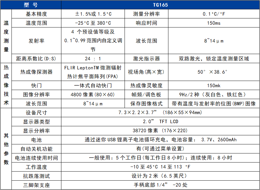 TG165搭(dā)載了FLIR專有的Lepton™微(wēi)型紅外熱像儀(yi)機芯,能夠有效(xiao)幫助用戶識别(bie)熱點,可靠地測(cè)量溫度,以及儲(chǔ)存生成報告所(suo)需的圖像和數(shù)據。其距離系數(shu)比爲24:1,用戶可在(zai)更安全的距離(lí)範圍内獲取精(jīng)确的讀數。TG165配有(yǒu)直觀的菜單圖(tu)标和雙激光指(zhǐ)示器,操作十分(fen)簡便。本産品堅(jian)固耐用,相信不(bú)久便會成爲您(nín)的理想測溫工(gong)具。