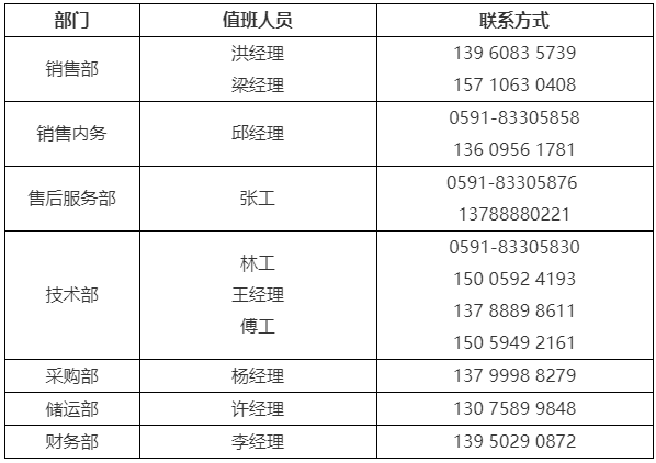 3、公司各部(bu)門值班人員及(jí)聯系方式如下(xià):