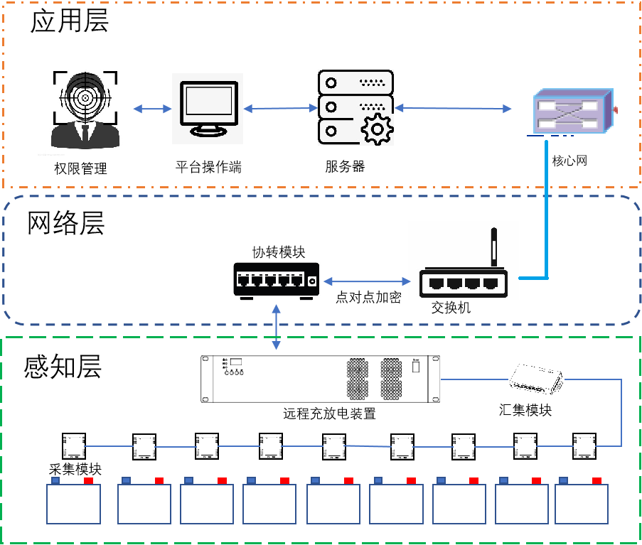 基于(yú)現有石化(huà)通信網絡(luò),研制以電(dian)池采集模(mó)塊和遠程(cheng)🌂充放🏃♀️電裝(zhuāng)置爲物理(li)感知層;各(gè)模塊間的(de)通訊及控(kòng)制爲網絡(luò)交互層;智(zhi)😄能運維平(ping)台軟件爲(wei)平台層的(de)蓄電池組(zǔ)遠程智能(neng)運維系統(tǒng)。