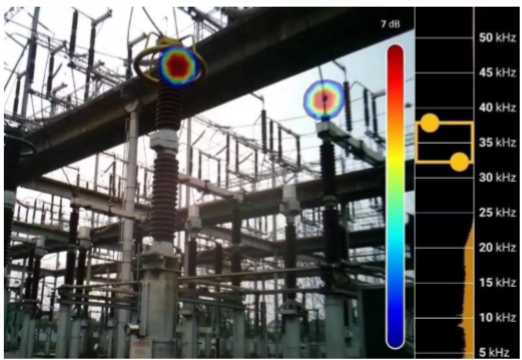 通過觸(chu)摸屏快速(su)調整聲學(xue)成像儀的(de)頻段,局部(bu)放電🚶的頻(pín)段📱通👅常在(zai)30-40kHz左右,所以(yi)該聲學成(chéng)像儀的頻(pín)段設置在(zài)32.5kHz-37.5kHz(黃色框),既(ji)能清晰地(di)反映出局(jú)部放電的(de)位置,又可(ke)以有效屏(ping)蔽現場的(de)噪聲幹擾(rǎo)。