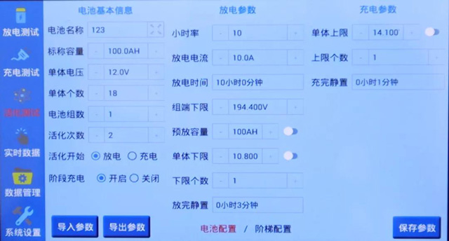 放(fàng)電結束(shù)後,可直(zhí)接對被(bèi)測電池(chi)組充電(diàn)。點擊【充(chōng)電測試(shi)】,在💞【階🔆段(duàn)充電】處(chu)選擇開(kai)啓,點擊(ji)【階段設(shè)置】,即可(ke)📧針對🏃♂️充(chōng)電過程(chéng)4個階段(duàn)進行參(cān)數設置(zhì),科學高(gāo)效的充(chong)電方式(shi),保證💯電(diàn)池充滿(mǎn)且不損(sun)傷電池(chi)。
