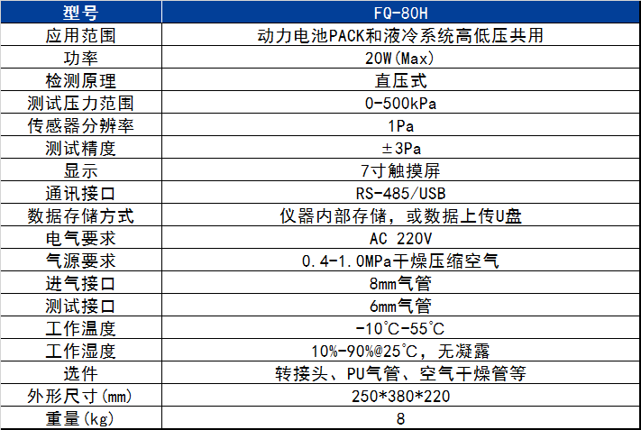 FQ-80H 氣密測試儀(高(gao)壓)是福光電子(zi)針對新能源行(háng)業推出的一款(kuan)高精度無損檢(jian)測設備,具有業(ye)界最高的靈敏(min)🈲度和穩定🌐性。該(gāi)設備主要運用(yòng)壓縮空氣爲介(jiè)質,通過檢測産(chan)品内部或密閉(bì)腔體内壓力微(wēi)量變化,判斷待(dài)⛷️測試産品的密(mì)封性。具備使用(yòng)方便快捷、檢測(cè)成本低、對環境(jìng) 及被測對象無(wú)污染等諸多優(yōu)點,有效提升新(xin)能源行業客戶(hu)♋的檢測效率與(yu)産品質量。