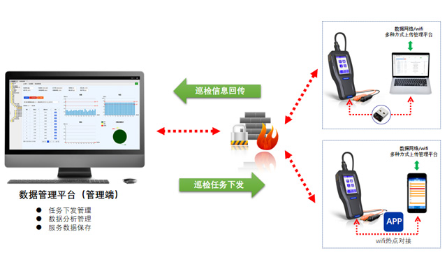 福光電子(zi)配置的雲端管理(li)平台通過局域網(wang)/互聯網與手持式(shì)終端數據同步傳(chuan)輸,實現測試數據(ju)的智能管理,包括(kuo):數據自動入庫、标(biāo)準值智能判定,靜(jìng)态生命周期參❄️數(shù)🚶♀️存🚶♀️取☎️,基于内阻變(biàn)化趨勢的壽命預(yu)測,蓄電池生命周(zhou)期曲線之❓電池故(gu)障标定等,高效地(dì)安排維護工作、統(tǒng)計維護成果。