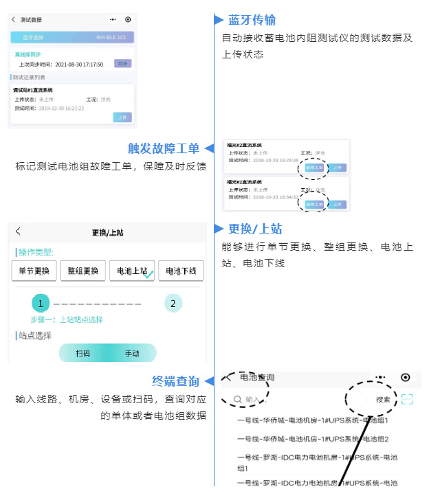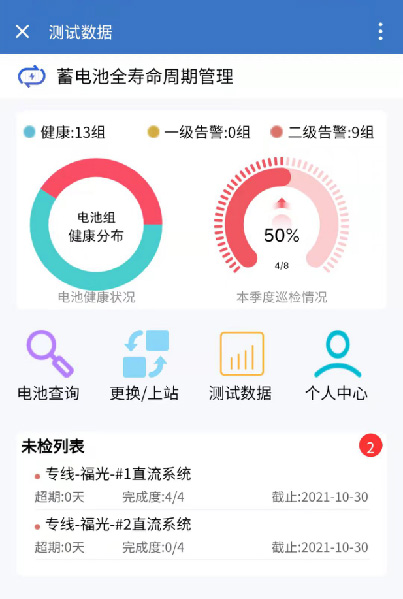 3.支(zhi)持測試過程中異(yi)常電池故障标記(ji),便捷觸發故障工(gong)單的生成,并同步(bù)故障工單,方便☂️彙(hui)報故障🏃🏻以及計劃(hua)檢修工單發布。