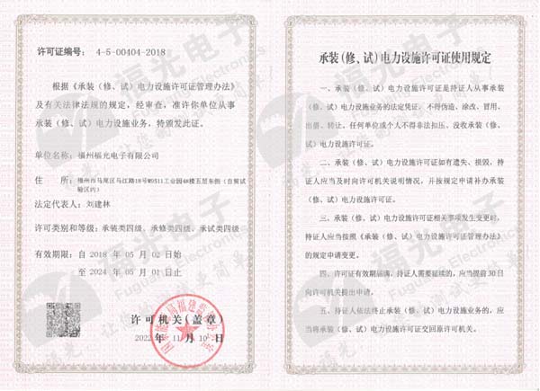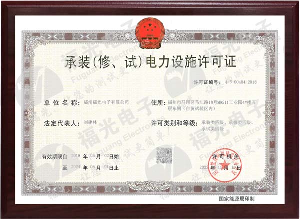 《承裝(修、試)電力(li)設施許可證》四(si)級資質,電力專(zhuan)業水準獲行業(ye)權威認可。該證(zhèng)書的獲得,标志(zhi)🧑🏽🤝🧑🏻着福光電子具(ju)備35千伏及以下(xià)電壓等級電力(li)設施的安裝、維(wei)修和試驗的能(néng)力,爲福光在全(quan)國電力工程領(lǐng)域開拓市場提(ti)供了重要保障(zhang)。