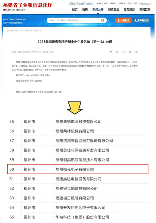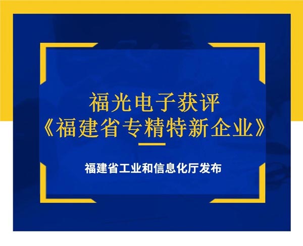 12月(yuè)4日,福建省工(gōng)業和信息化(huà)廳發布《2023年福(fú)建省專精特(tè)新中小企業(ye)名單(第一批(pi))公示》,福州福(fu)光電子有限(xiàn)公司順利通(tōng)過審核并且(qiě)完成公示,被(bei)評爲福建省(shěng)“專精特新中(zhong)小企業”和“創(chuàng)新型中小企(qǐ)業”兩項殊榮(róng)