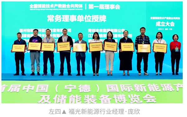 在共同體第一(yī)屆理事會全體(ti)會議上,福光電(dian)子當選㊙️爲常務(wù)理事單位,新能(neng)源行業經理龐(pang)欣(圖中左四)代(dai)表公司出🍓席并(bing)接受常務理事(shì)單位的授牌。