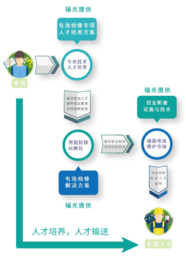 作爲(wei)專業的電池運(yùn)維檢測儀器與(yu)設備制造商,福(fú)光電子依托自(zì)身儲能電池運(yun)檢設備産業的(de)技術優勢和對(dui)行業的深❌刻理(li)解, 爲儲能後市(shì)場電池檢修人(ren)才培養打造集(ji)電池教學、科研(yan)、培訓、社會服務(wu)的一體化方案(àn) ,助力培養儲能(néng) 技術領域”高素(su)質技術技能" 人(ren)才,以産教融合(hé) 推動儲能技術(shu)産業高質量發(fa)展。