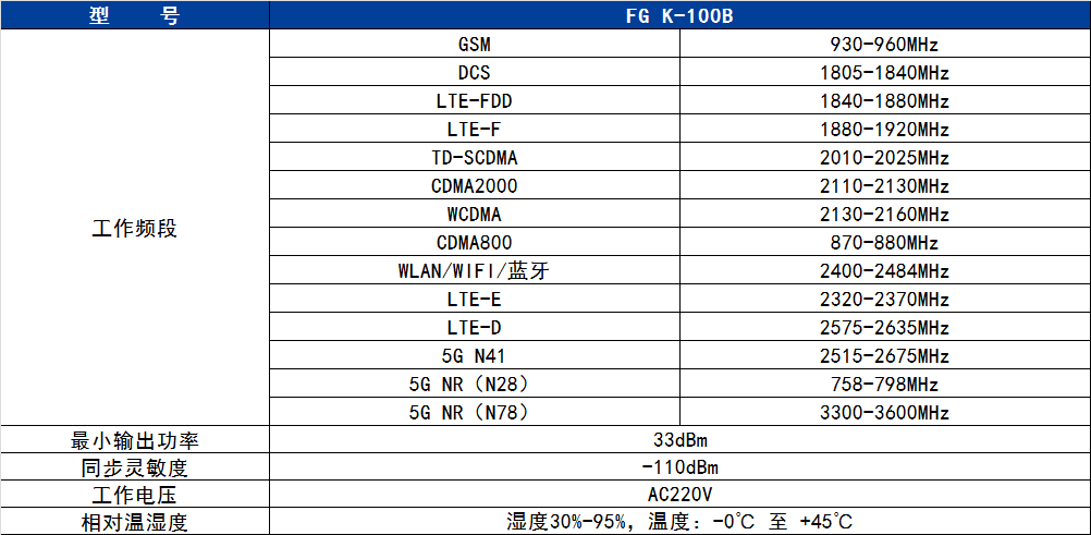 FG K-100B全網(wang)型數字信号屏(ping)蔽器能夠有效(xiao)屏蔽手機2G/3G/4G/5G以及(ji)Wifi和GPS。其發射功率(lü)大,覆蓋範圍廣(guang),可長時間穩定(dìng)持續工作,同時(shí)對TDD、5G基站上行無(wú)幹擾。主要應用(yong)于監獄、考❓場、保(bǎo)密會議、學♉校等(deng)需要保密性場(chǎng)所。